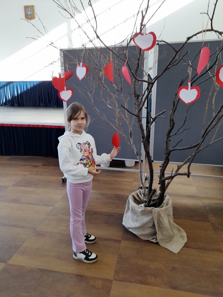 Dzieci ozdobiły też drzewo biblioteczne liśćmi w kolorach narodowych, które było dekoracją na Gminne Narodowe Święto Niepodległości.