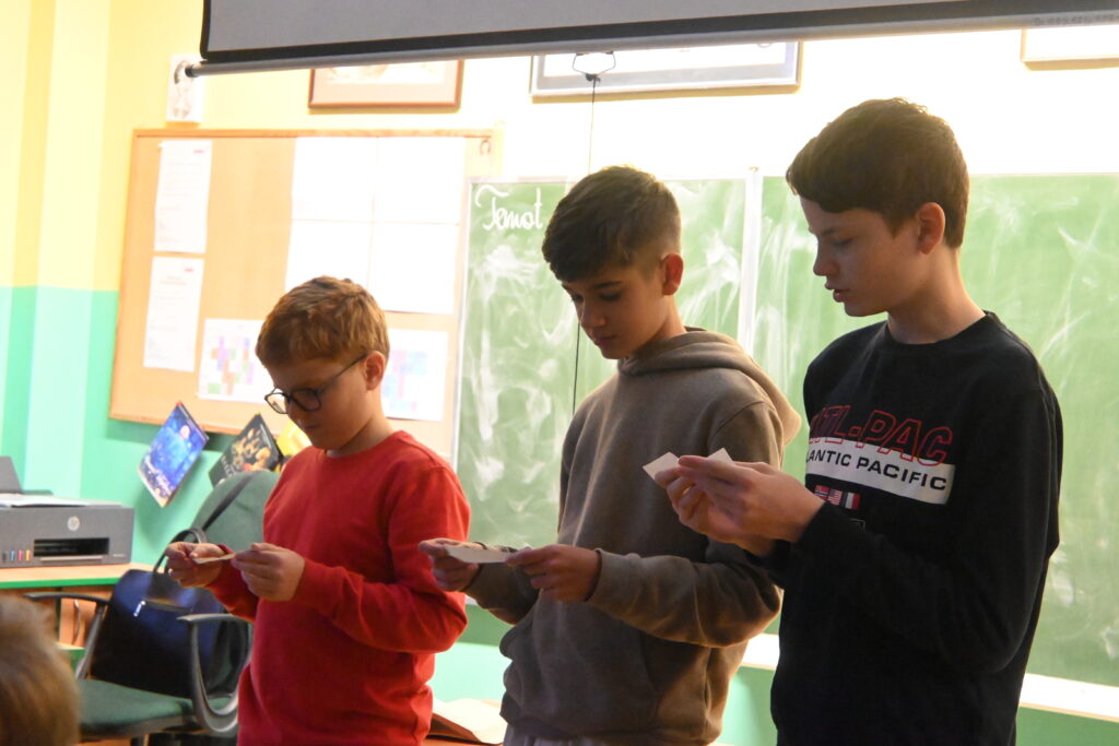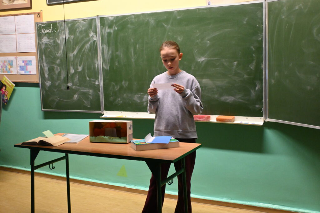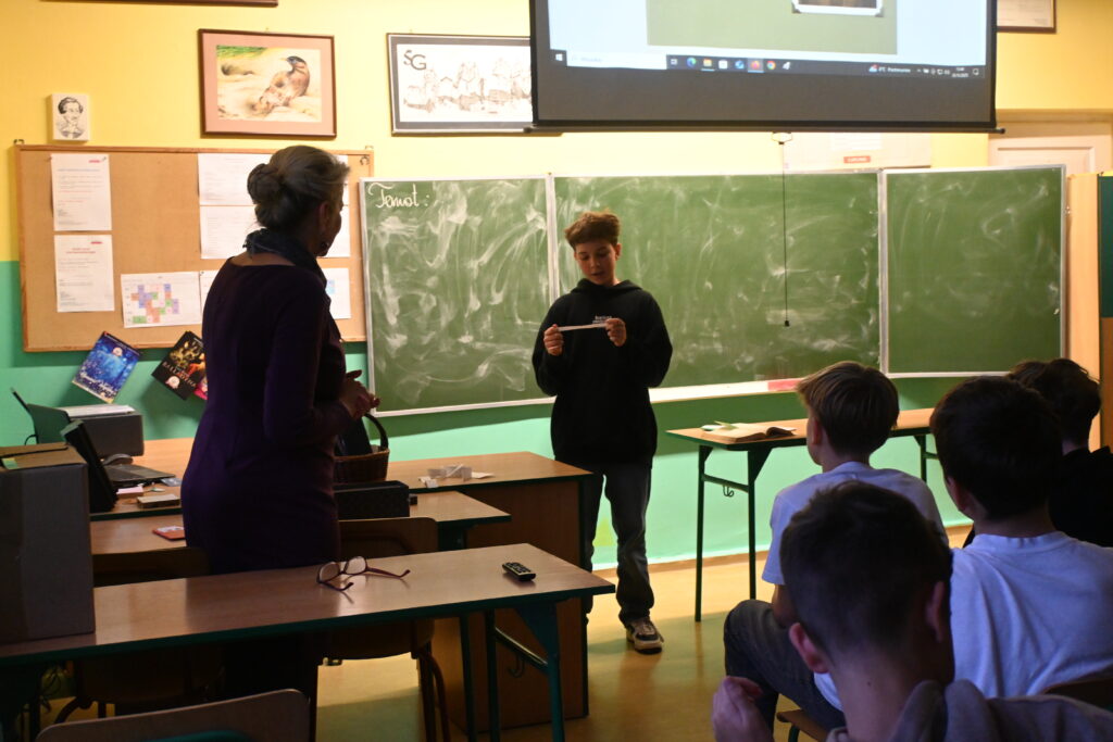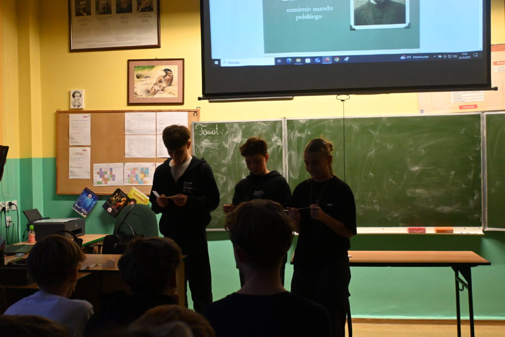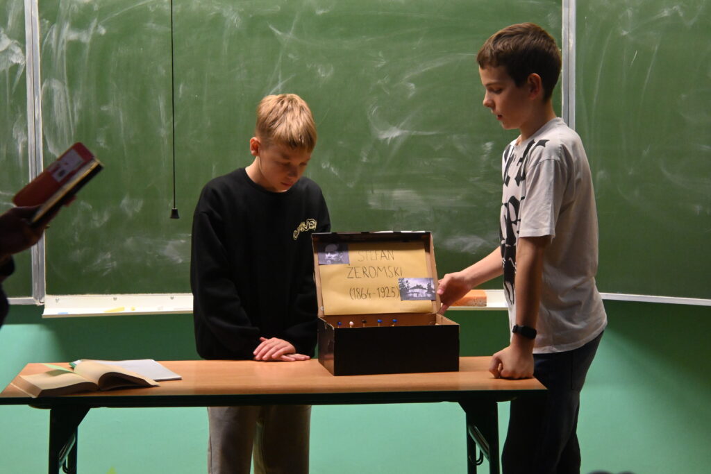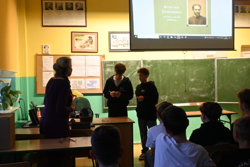 28 października odbyło się podsumowanie pracy warsztatowej. Siódmoklasiści zaprezentowali przygotowane w grupach prezentacje oraz pudełka lekturowe. Wykazali się przy tym zaangażowaniem i kreatywnością. Na zakończenie aktywnie uczestniczyli w konkursie na temat Stefana Żeromskiego i jego dramatu.
