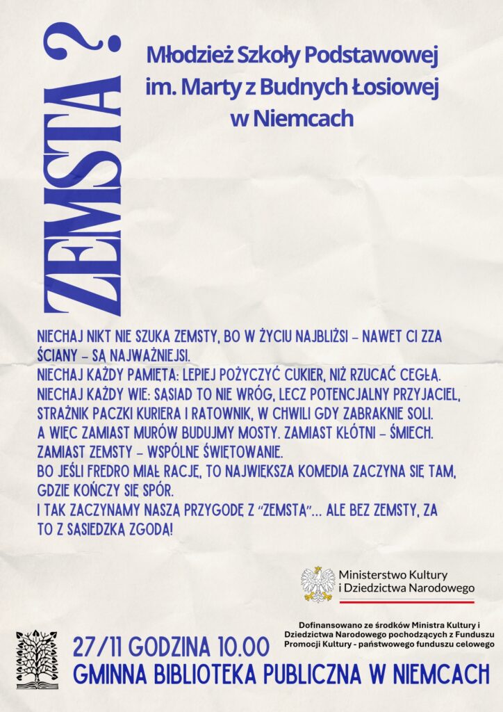 Wśród literackich patronów roku 2025 jest Stefan Żeromski. Jeden z ostatnich jego utworów to dramat pt. „Uciekła mi przepióreczka”, którego prapremiera odbyła się sto lat temu w 1925 roku. Dlatego też Gminna Biblioteka Publiczna w Niemcach realizowała projekt „Uciekła mi przepióreczka” – warsztaty edukacyjne na podstawie dramatu Stefana Żeromskiego, w którym uczestniczyli uczniowie Szkoły Podstawowej im. Marty z Budnych Łosiowej w Niemcach.
