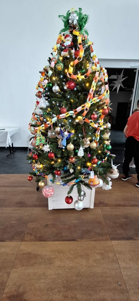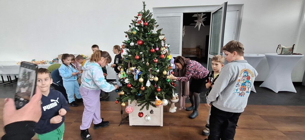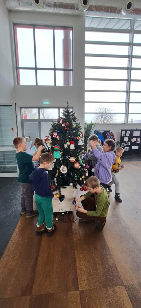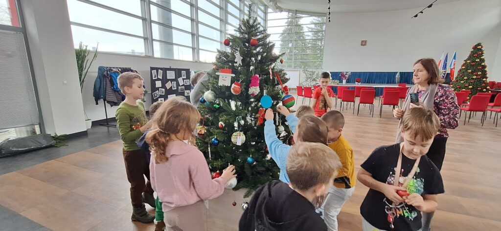 Kiedy choinka była już cała udekorowana drzewko zabłysło kolorowym światłem. Na zakończenie dzieci otrzymały upominki . To było bardzo miłe i radosne spotkanie, które wprowadziło wszystkich w świąteczny nastrój.